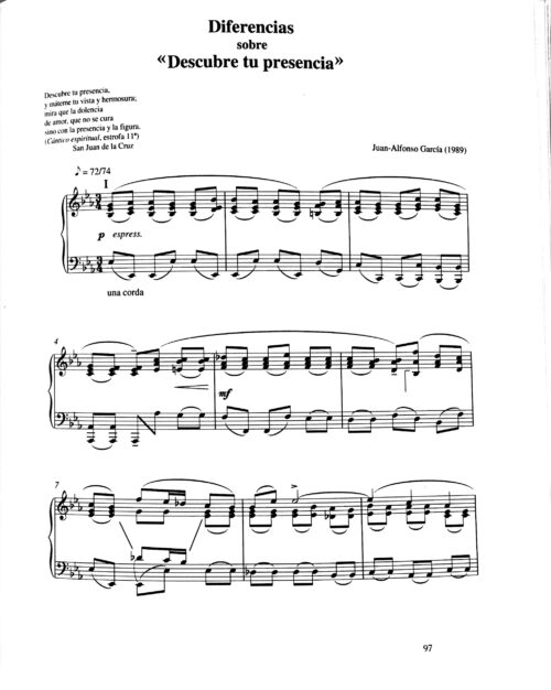 Las Diferencias sobre «Descubre tu presencia» son de influecnia formal organística. las cuatro diferencias de que consta esta obra, inspirada en el cuadro Catedral de Granada de Manuel lópez-Vázquez, están basadas en el aria para mezzosoprano del oratorio Cántico espiritual de Juan-Alfonso.