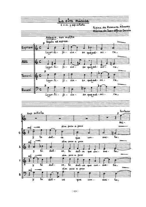 INFORMACIÓNPARTITURAAUDIOINFORMACIÓNJUAN-ALFONSO GARCÍAAño de composición: 2002Número de catálogo: JA-484 DETALLES: Madrigal. Poema de Rosaura Álvarez EDITADO: DISCOGRAFIA: PARTITURAAUDIO https://compositorjuanalfonsogarcia.com/wp-content/uploads/2022/06/18-La-Otra-Musica-1.mp3 Categoría: MÚSICA CORALNavegación entre proyectos