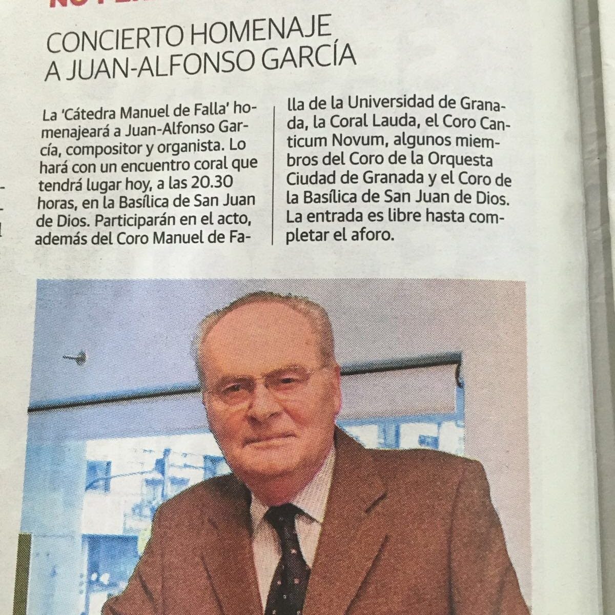 GRANADA HOY | 16/05/2016 | La Catedral acoge esta tarde un homenaje a Juan Alfonso García